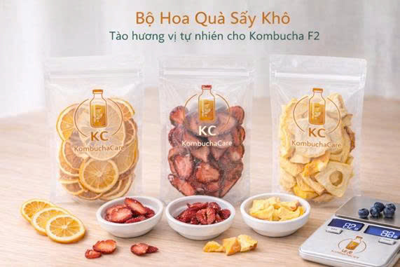 Bộ hoa quả sấy khô chuyên dùng để tạo hương vị tự nhiên cho Kombucha giai đoạn F2. Trái cây được chọn lọc kỹ lưỡng, sấy khô đúng chuẩn giúp giữ mùi thơm và màu sắc tự nhiên.